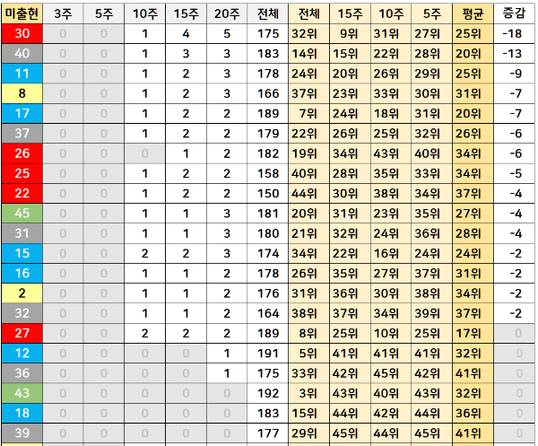 아래 표는 최근 5주간 미출현 번호 내역입니다. 여러 기간별로 당첨횟수를 계산했으니, 과거에는 인기가 있었던 번호들도 보이네요.
