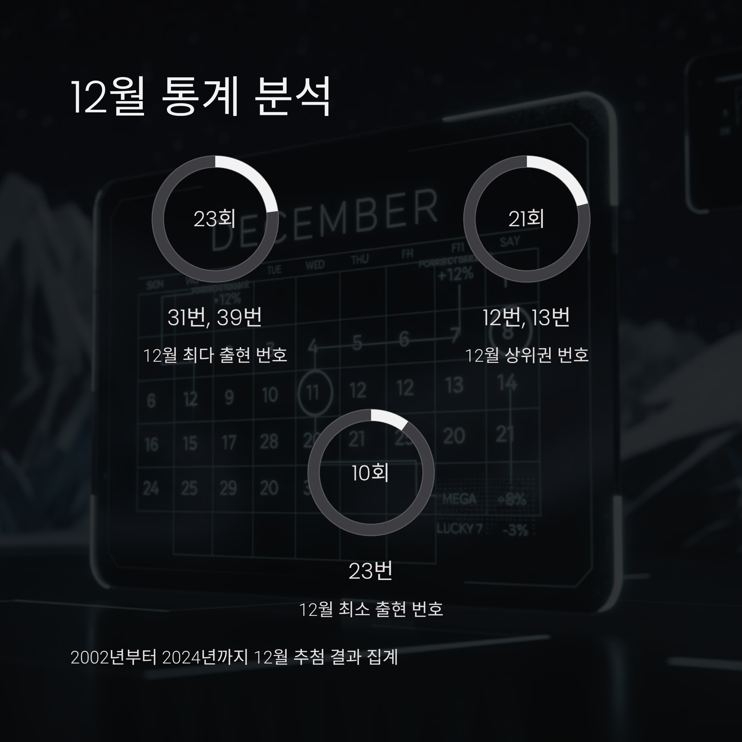 반면 23번은 10회로 12월에 가장 적게 나온 숫자입니다. 12월 추첨기는 3호기를 사용하므로, 3호기 출현 데이터도 함께 고려해야 합니다.