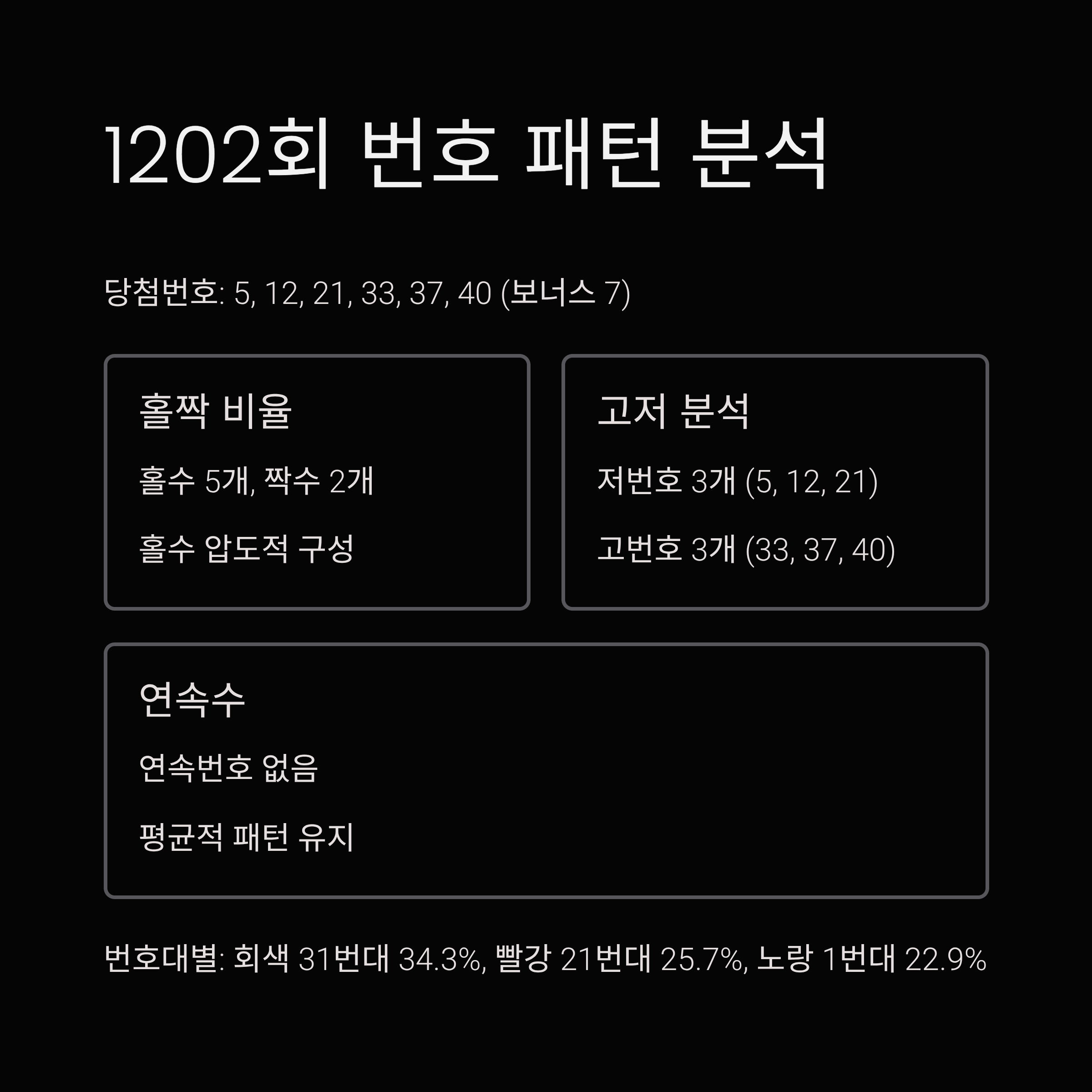 1202회 당첨번호의 홀짝 비율은 홀수 5개, 짝수 2개였습니다. 보너스를 포함하면 홀수가 압도적으로 많은 구성이었습니다. 5번 21번 33번 37번 7번이 홀수이고, 12번 40번만 짝수였습니다.