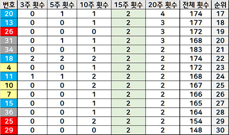 15주이면 약 4개월 기간인데, 장기간 많이 추첨되는 번호가 이번주 1067회 로또 번호 일치 확률이 높지 않을까요?