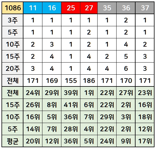 1086회 로또 당첨번호를 분석한 결과입니다. 로또 1등 예상번호를 추출하는데 활용하시길 바랍니다.