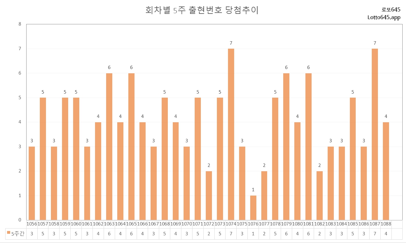 1088회 로또복권 추첨에서는 직전 5주간 출현 번호에서 4개 번호가 명중하였습니다. 최근 5주 동안 당첨된 번호들이 많이 1등 번호에 나오고 있다는 것을 회차별 당첨추이에서 알 수 있습니다.