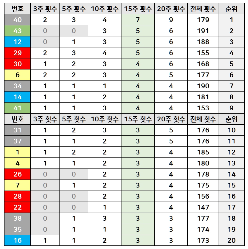로또번호를 선택하는데 15주간 순위에서 중하위에 있는 숫자들도 예상번호에 포함시켜야 합니다.