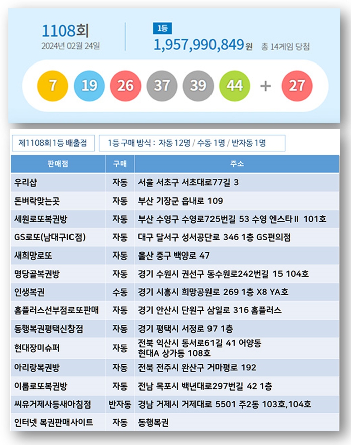 로또 1109회 1등 당첨 예상번호 분석, 1108회 로또 당첨번호 최근 트렌드 1등 당첨지역 로또판매점