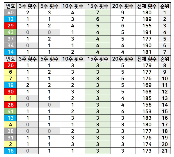 15주 기간 동안 40번이 가장 많이 나왔습니다. 총 7회 당첨되었고, 12 29 숫자도 다수 당첨된 번호입니다.
