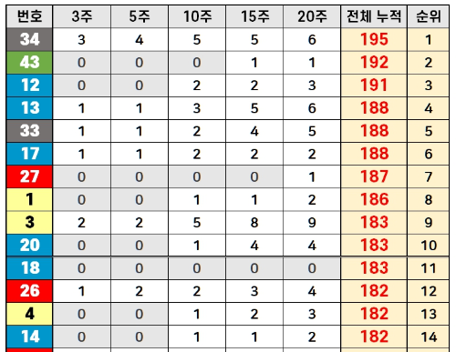 역대 최다 당첨번호는 34번으로, 총 195회 당첨된 기록을 가지고 있습니다. 이는 다른 번호에 비해 상대적으로 높은 출현 빈도를 보이며, 예상번호 조합에 포함될 가능성이 높음을 의미합니다.